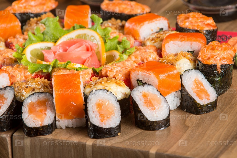 Крупный план суши на деревянной тарелке