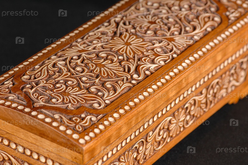 Художественная резьба по дереву на шкатулке на черном фоне. Средняя Азия, Узбекистан, крупный план