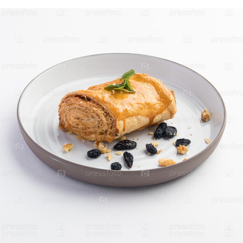 Красивый снимок вкусных сладких рулетиков с грецкими орехами, изюмом и сахаром