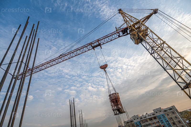 Низкоугольный снимок крана с оборудованием на строительной площадке рядом с новой строительной инфраструктурой