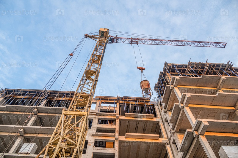 Низкоугольный снимок крана с оборудованием на строительной площадке с новой строительной инфраструктурой. Заливка бетона в форму