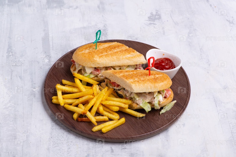 Тарелка картофеля фри и куриный сэндвич с кетчупом на ярком фоне