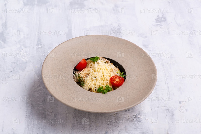 Блюдо в красивой миске с пармезаном сверху на сером фоне
