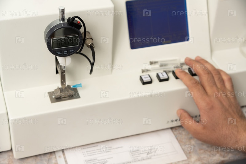 Крупный план руки, использующей медицинскую машину для тестирования и производства фармацевтических шприцев