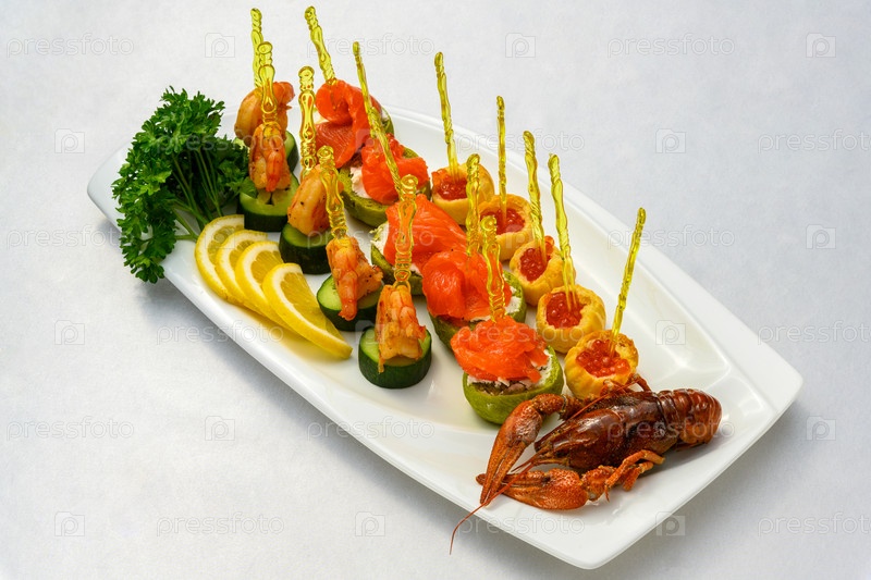Приготовленный рак с закусками на шпажках на тарелке