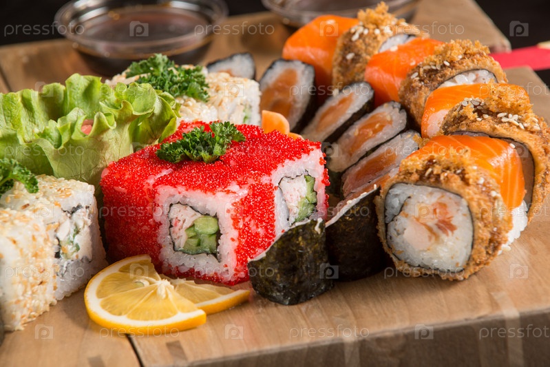 Крупный план суши на деревянной тарелке