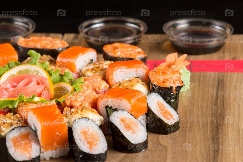 Крупный план суши на деревянной тарелке