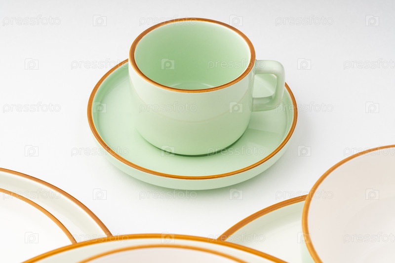Набор керамической посуды на белом фоне