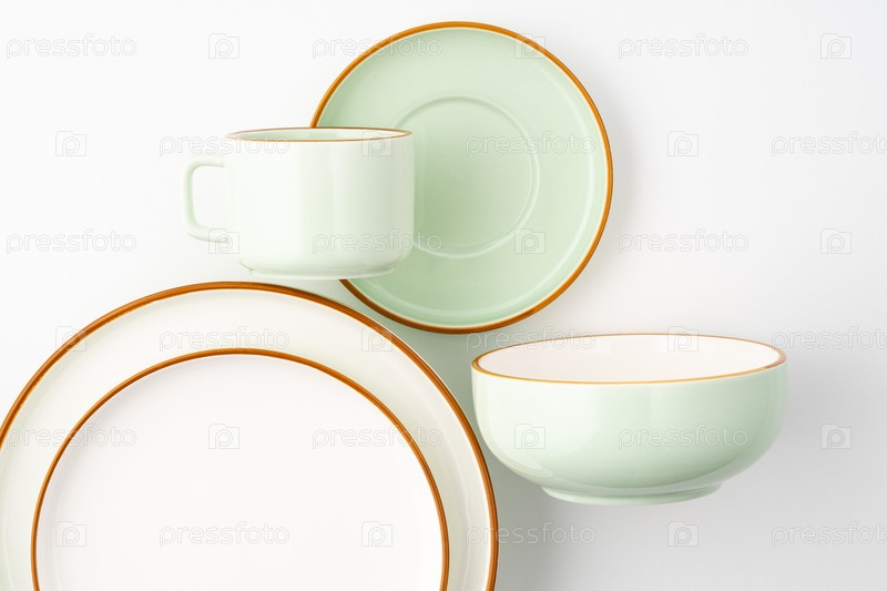 Набор керамической посуды на белом фоне