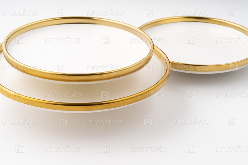 Набор белых и коричневых керамических тарелок на белом фоне