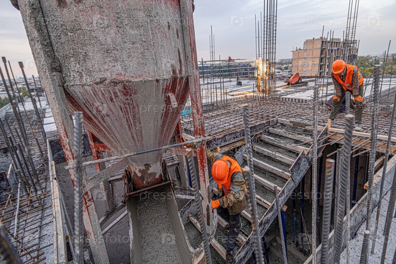 Рабочие на крыше инфраструктуры здания с машинами и инструментами. Заливка бетона в форму
