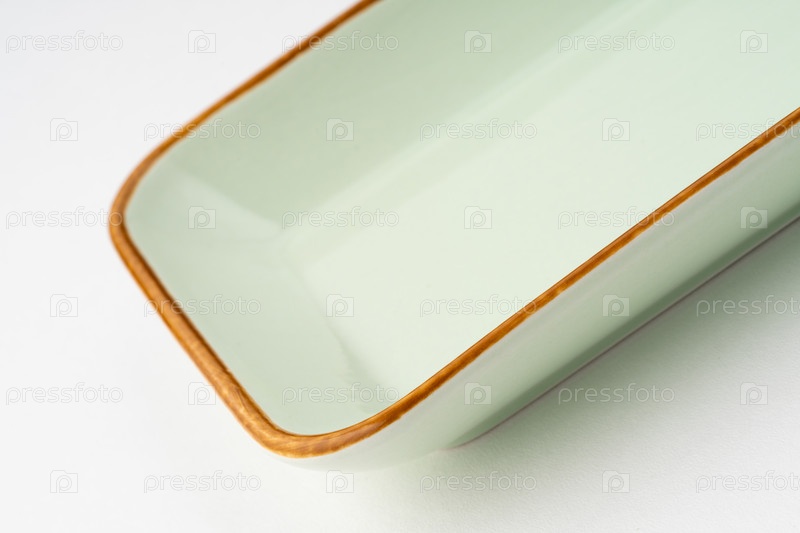Одна керамическая зеленая прямоугольная тарелка на белом фоне