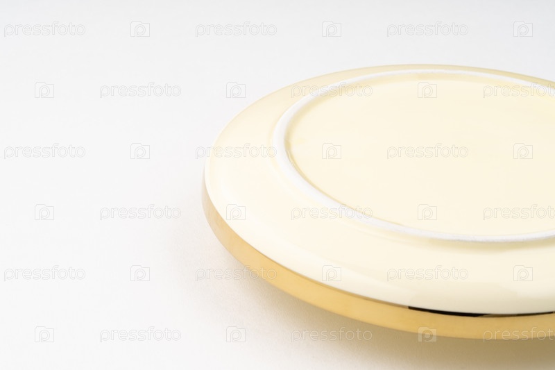 Крупный план нижней стороны золотой тарелки на белом фоне
