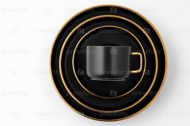 Набор черных и золотых керамических тарелок и чашки на белом фоне. Вид сверху