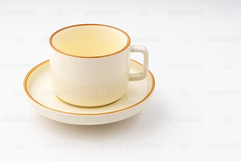 Набор белых и коричневых керамических тарелок и чашек на белом фоне