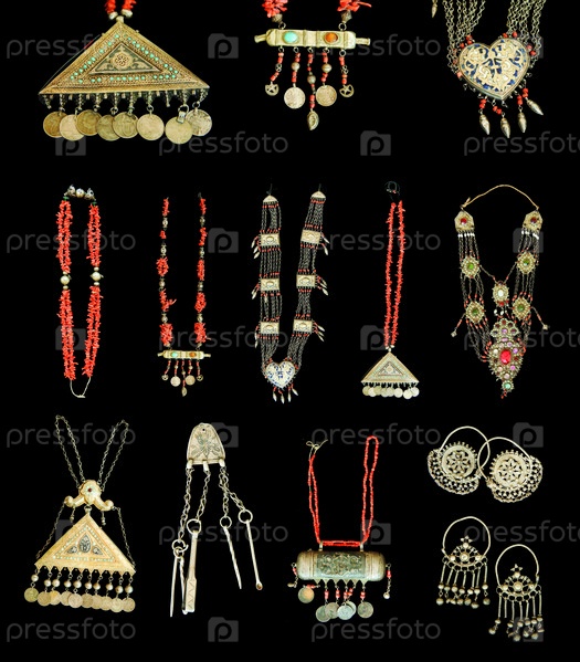 Набор старинных подвесок и серег с драгоценными камнями, изолированными на черном фоне