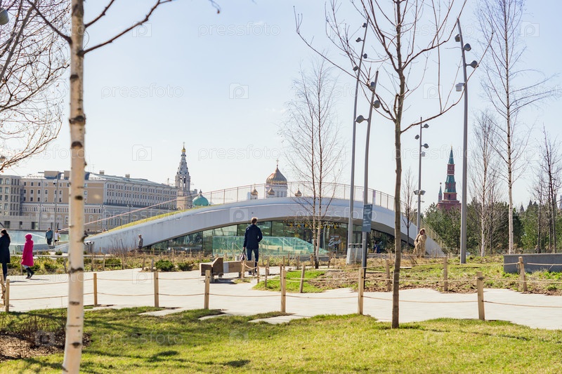 Москва, Россия, 11 апреля 2018 г. Ландшафтный парк "Зарядье" в центре Москвы