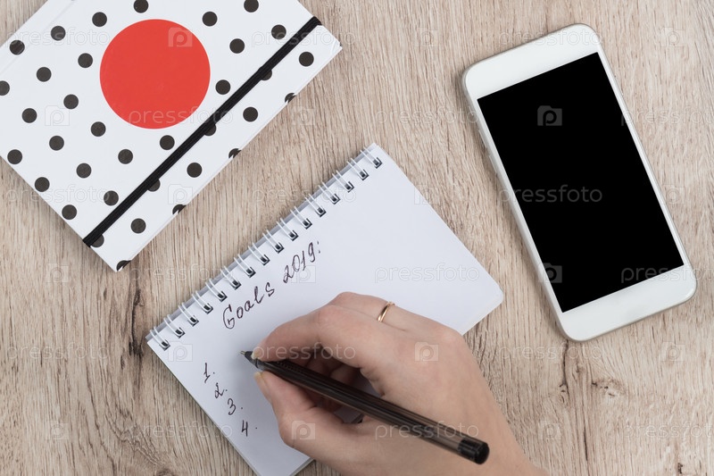 Руки молодой женщины держат открытые страницы блокнота с черной ручкой на деревянном столе. Список целей на 2019 год