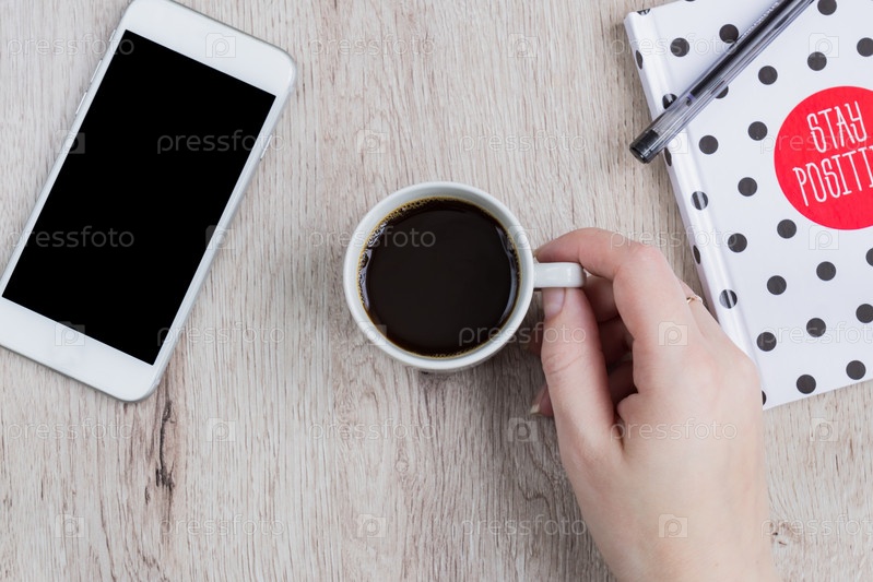 Концепция бизнеса и офиса - черно-белый блокнот в горошек, смартфон и чашка черного кофе на деревянном столе. вид сверху