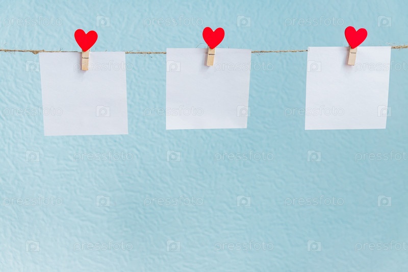 Красные штыри сердца влюбленности валентинки висят на естественном шнуре против голубой предпосылки. Макет концепции для вашего текста