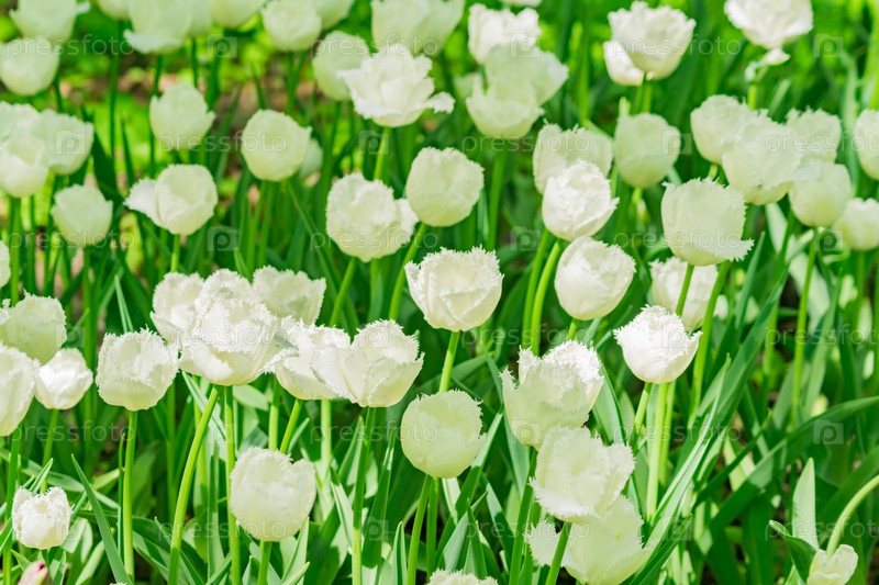 Поле белых тюльпанов. Цветочный фон. Пейзаж летнего сада