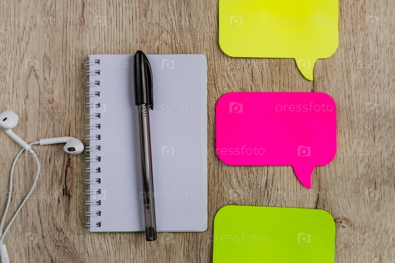 Концепция бизнеса и офиса - пустой блокнот, наушники, наклейки и черная ручка на деревянном столе. Минимальная плоская планировка, вид сверху