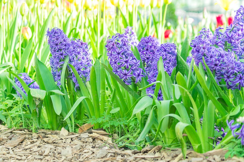 Цветущий голубой гиацинт (Hyacinthus orientalis), растущий на клумбе.Цветочный фон, садоводство.Весенняя праздничная открытка, цветочный фон