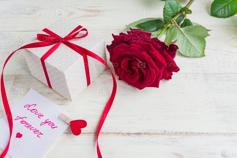 Бежевая подарочная коробка в горошек с бантом из красной ленты и красивыми красными розами на деревянном фоне. Открытка к празднику