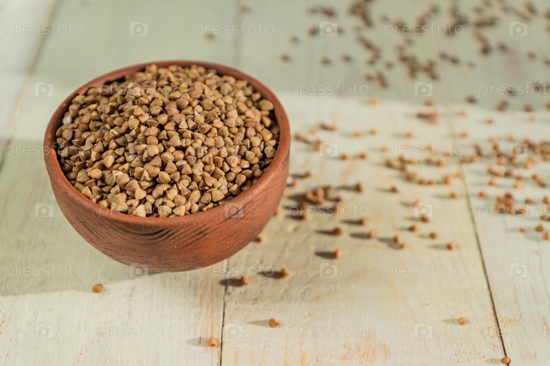 Сухая гречка в коричневой глиняной миске на деревянном столе. безглютеновое зерно для здорового питания