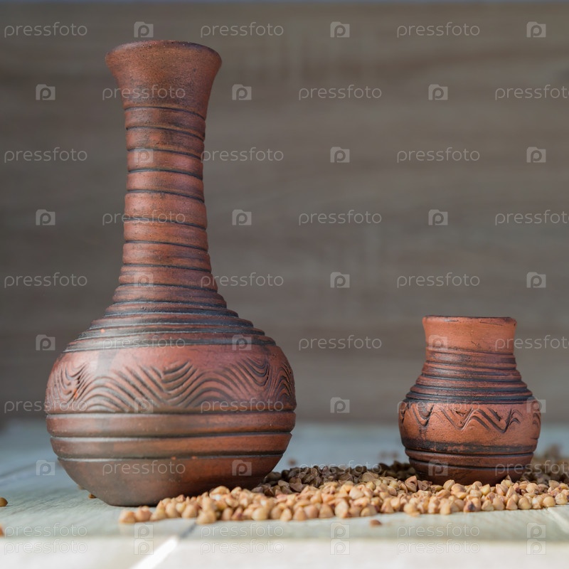 Глиняные банки для молока и гречки разбросаны по деревянному столу