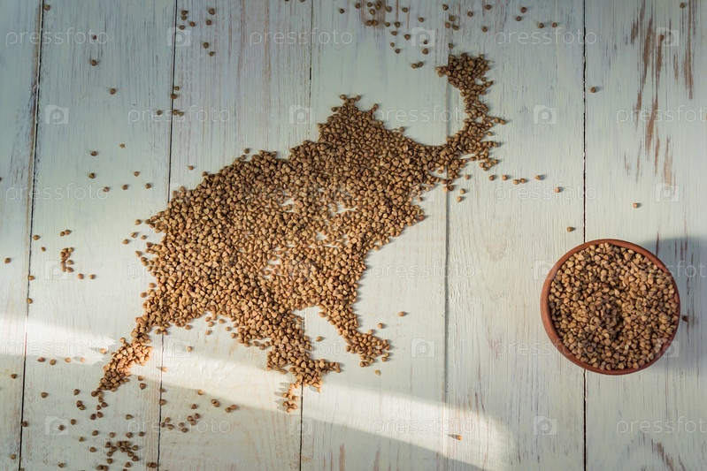 Вид сверху на гречку, разбросанную по деревянному столу в форме слона. Креативная деревенская упаковка