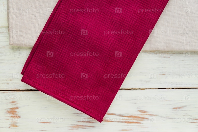 Вид сверху на тканевые салфетки бежевого и бордового цветов на деревенском белом деревянном фоне