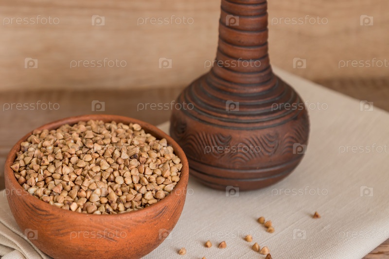 Сухая гречка в коричневой глиняной миске на деревянном столе. безглютеновое зерно для здорового питания
