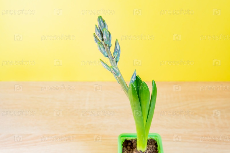 Синий цветок гиацинта закрыл бутон в зеленом транспортном горшке на желтом фоне. Скопируйте пространство