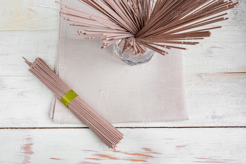 Сырая лапша соба на белом деревянном столе и текстильной ткани. Традиционная японская еда. Вид сверху
