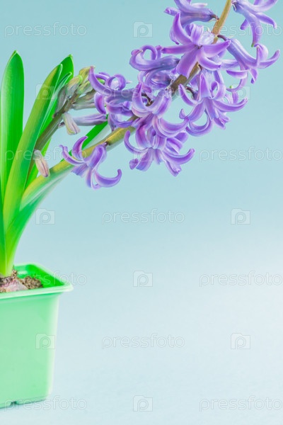 Цветущий голубой цветок гиацинта в зеленом пластиковом горшке на синем фоне. Скопируйте пространство