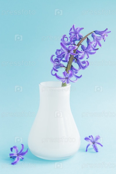 Красивый цветущий гиацинт в вазе из белого стекла на синем фоне. Весенний букет для украшения интерьера