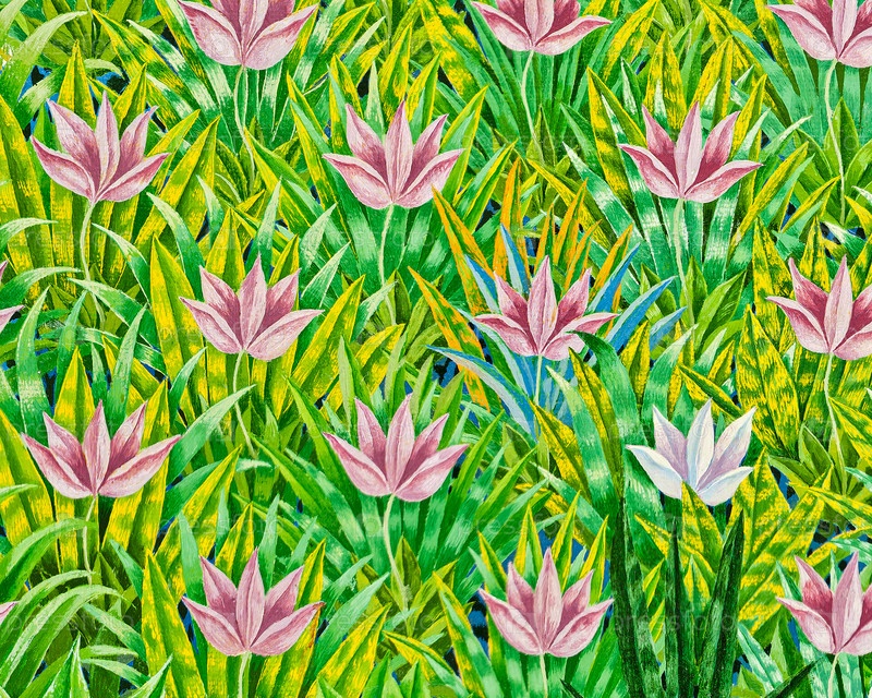 Иллюстрированная картина поля с зеленой травой, наполненного розовыми цветами