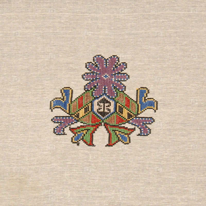 Крупный план абстрактного красочного рисунка вышивки на бежевой ткани