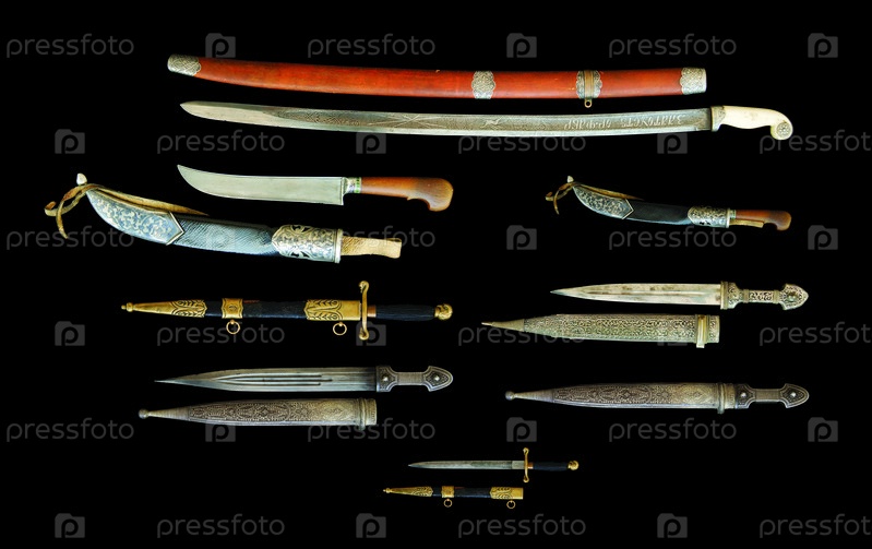 Набор старинных ножей и кинжалов на черном фоне, Центральная Азия, Узбекистан