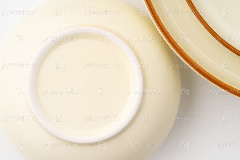 Набор белой и коричневой керамической тарелки и миски на белом фоне