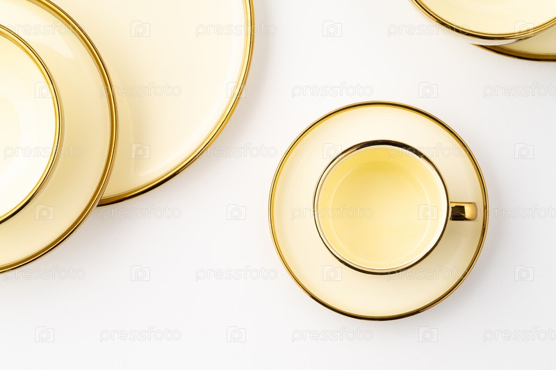 Набор золотой роскошной керамической кухонной утвари на белом фоне