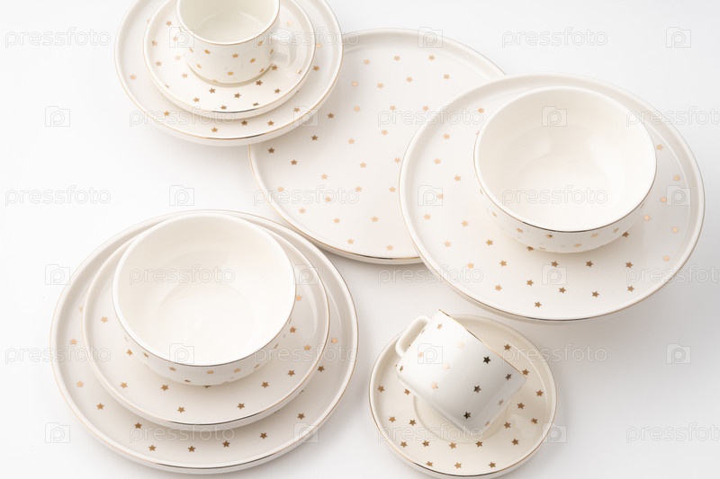 Набор керамической посуды на белом фоне