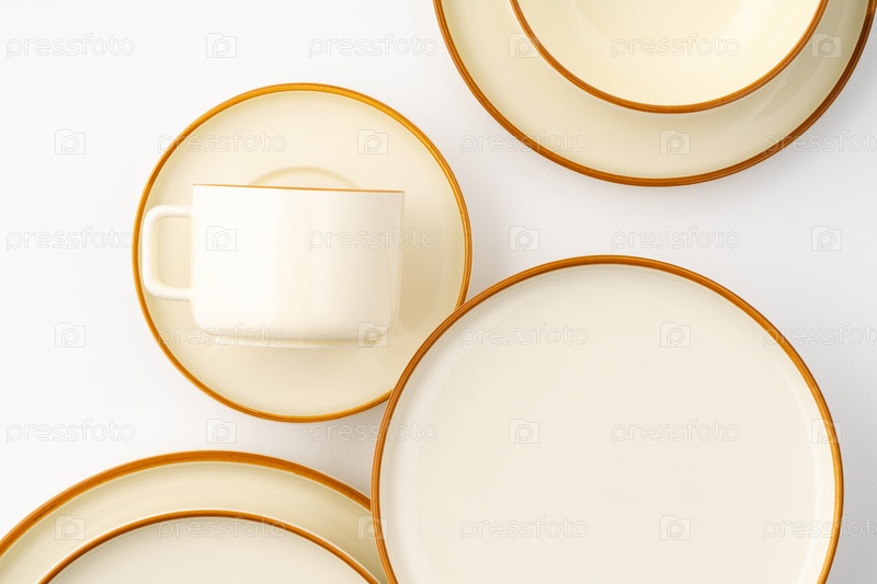 Набор белых и коричневых керамических тарелок и чашек на белом фоне. Вид сверху