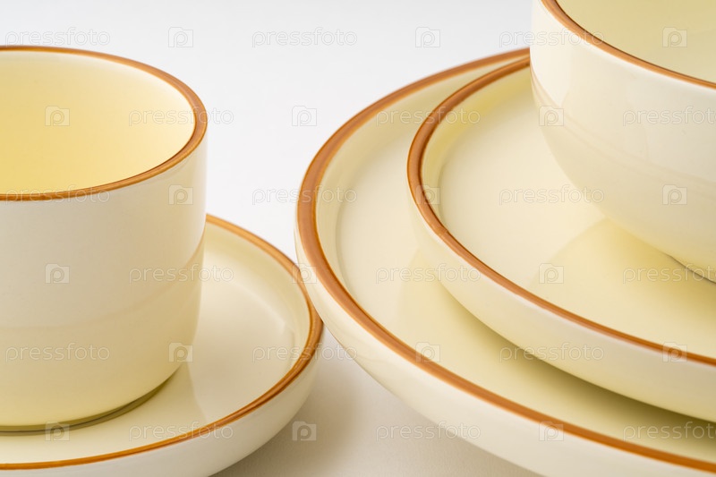 Набор из белой и коричневой керамической тарелки и чашки. Крупный план