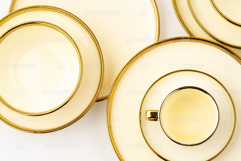Набор золотой роскошной керамической кухонной утвари на белом фоне