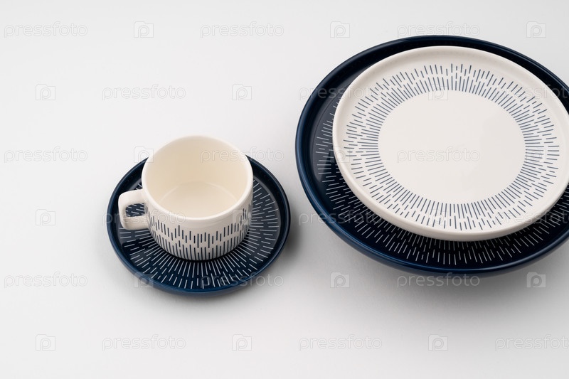Набор сине-белой роскошной керамической кухонной утвари на белом фоне