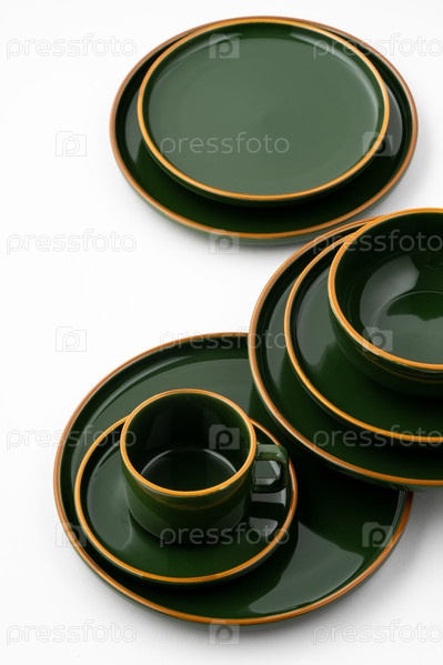 Набор темно-зеленой керамической посуды с оранжевыми очертаниями на белом фоне