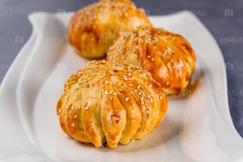 Фрикадельки, завернутые в слоеное тесто, покрытые кунжутом на белой тарелке