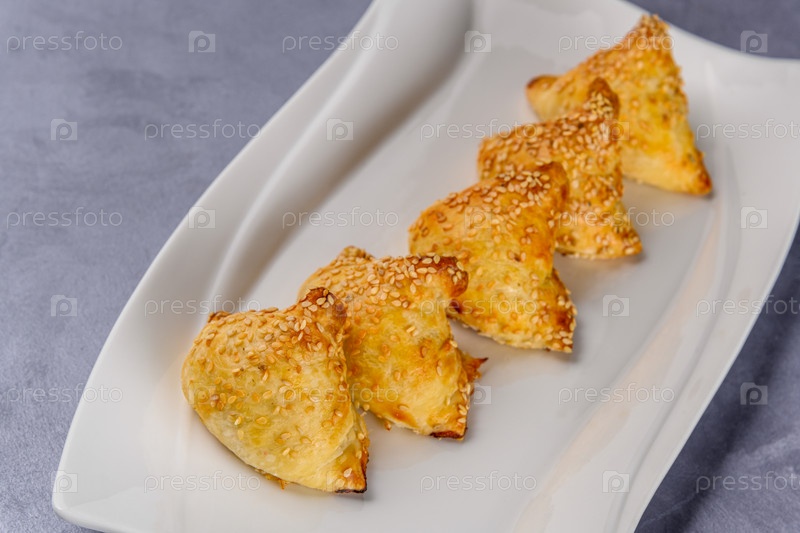 Фрикадельки, завернутые в слоеное тесто, покрытые кунжутом на белой тарелке